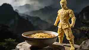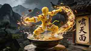 镜头极速360度环绕+跟焦人物,人物快速跳入碗中,碗中汤面翻滚、水花四溅强烈,然后施展金凤凰光带,挥掌带起金色掌花,镜头再次极速360度环绕+跟焦人物,捕捉掌花与转身的毫秒级动作,光带及面条牛肉片光斑因快速运 ...